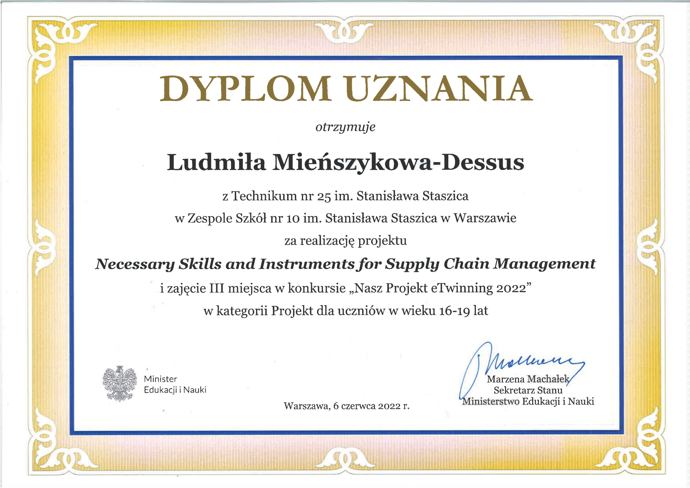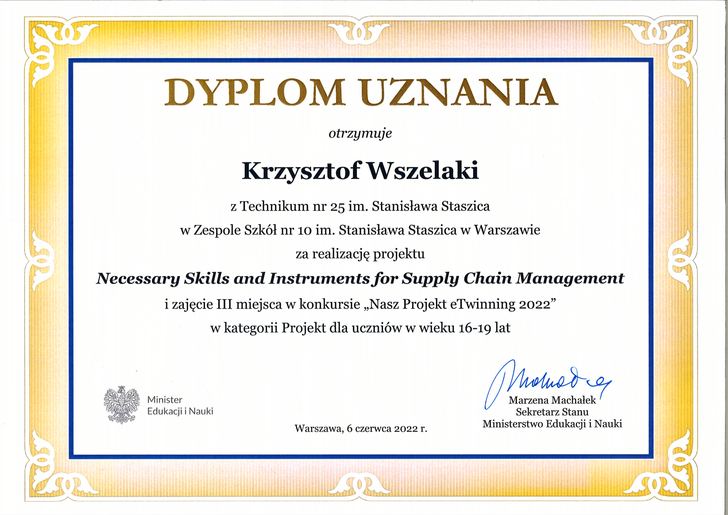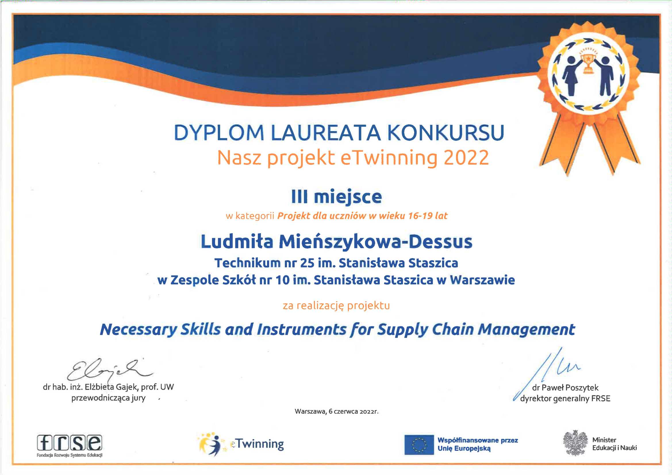 Projekt Necessary Skills and Instruments for Supply Chain Management zajął III miejsce w konkursie Nasz Projekt eTwinning 2022 organizowanym przy współudziale Komisji Europejskiej, w kategorii projekt dla uczniów w wieku 16-19.